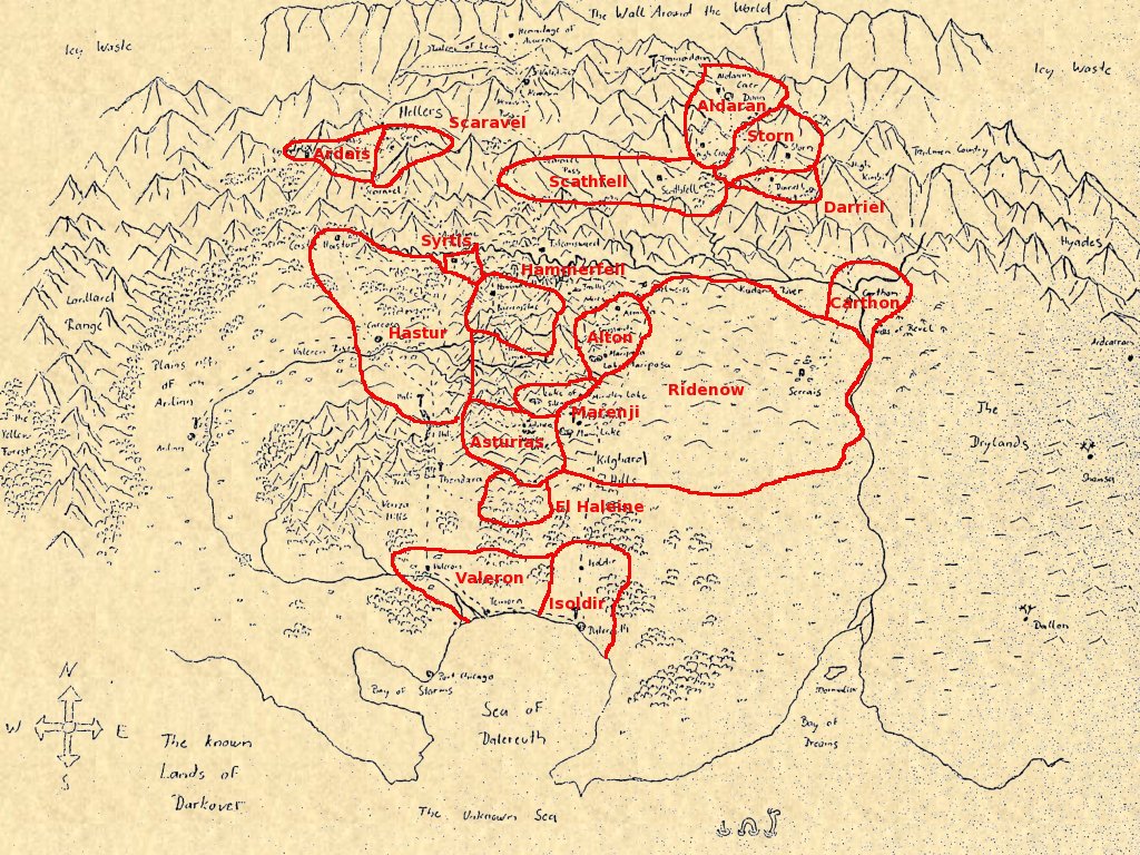 The mountain kingdoms of Storn and Darriel are conjectured. The Storns are mentioned as a political power in SQ:158 and HM:550 and still hold lands in WD, thus it is plausible that they would hold their own realm. Darriel is based on the existence of Darriel forst (WW:178,183). A Lord of Carthon is mentioned in WW:334, thus presumably Carthon was a realm in its own right at some point. The idea that Altons hold the realm around Armida is likewise inferred from the fact that the Alton family holds lands in the Kilghards earlier (SQ:171) and continue to do so in SS and FT.