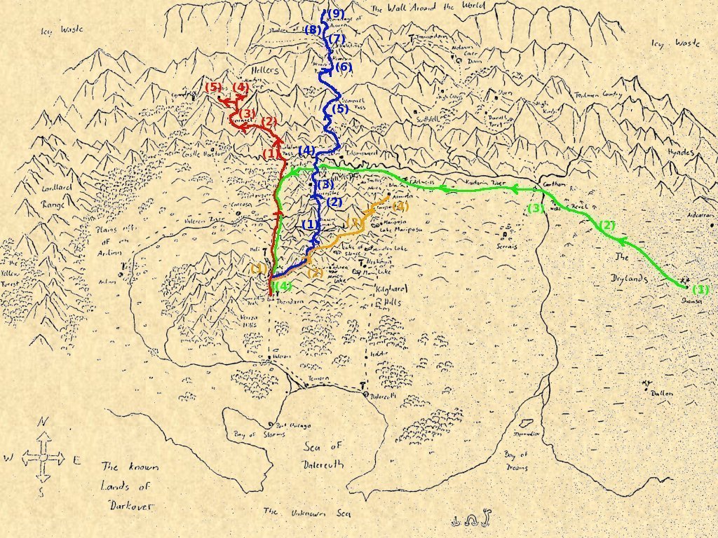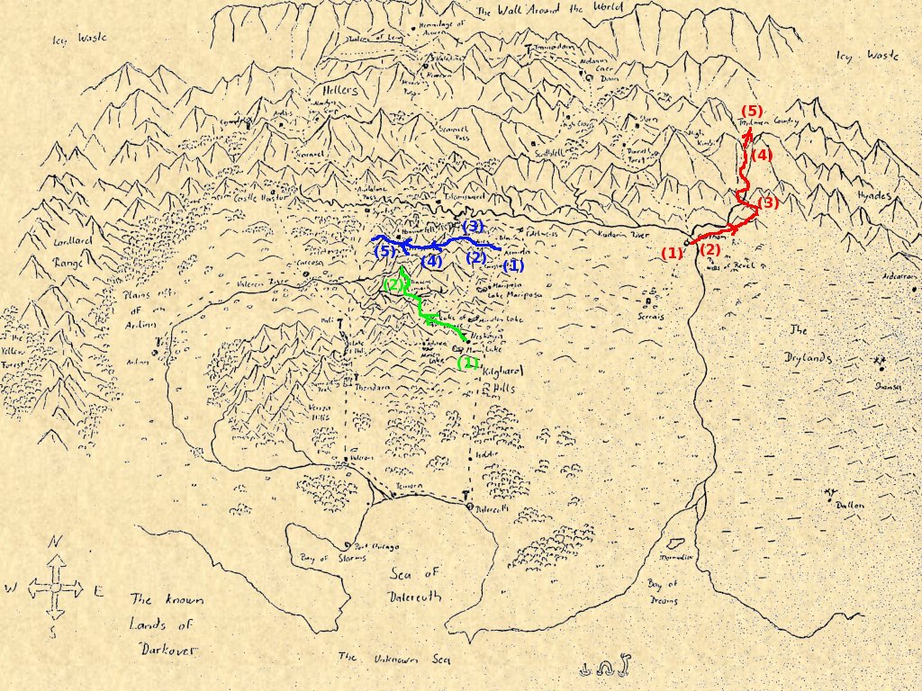 In blue: The journey of Melitta Storn. After escaping from Castle Storn (1), Melitta finds herself on the north side of the Kadarin (WD:620) struggling through the passes around High Kimbi (WS:623) (2) till she reaches Carthon (3) just in time to free her brother from a difficult situation.