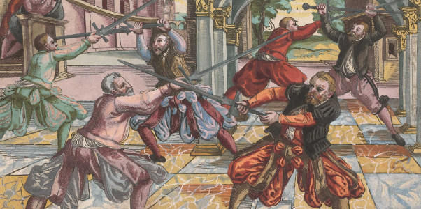 Perhaps not unexpected, the manual also contains a fair share of pommel strikes, grappling and throwing techniques for close play, supplemented by techniques for holding an opponent down when he is on the ground. It's hard to get a sense for what tactics Paurenfeyndt actually envisioned - clearly he deviates from Liechtenauer in places, but apart from sequences and the quoted Liechtenauer verses, he hardly describes his own idea of fencing. Perhaps then the manual is best understood as a collection of tricks and techniques that have proven useful in exchanges- and of course it provides an interesting historical data point between Liechtenauer and Meyer. Paurenfeyndt's manual on Wiktenauer MeyerJoachim Meyer's Gründtliche Beschreibung der Kunst des Fechtens ('Thorough Description of the Art of Fencing') of 1570 is a long and systematic introduction to the topic covering not only longsword (which Meyer regards as the basis of all fencing) but also dusack, rapier, dagger and polearms.By Meyer's time, fencing is no longer a necessity in war but is well into the transition to a sports activity. Thrusts are no longer done and no pommels are hammered into faces, so fencing for Meyer is primarily an exchange of cuts and while his system is based on Liechtenauers work, he finds little use for the old thrusting guards that provide poor opportunities for quick and powerful cuts. Meyer lays out longsword fencing for a complete beginner - he starts with basic elements like guards, cuts and parries, then discusses the general idea of an exchange as approach, attacks and retreat and only in the end gets to specific sequences from the various guards or from the master cuts like in the Liechtenauer Zettels, At the heart of the system is the idea of attacking in longer sequences of cuts moving from one opening to the other while keeping the opponent defending all the time. By executing some of these attacks for real, some only as feints, the opponent is not being given much opportunity to counter. If the opponent manages to get a defensive cut in, a bind usually develops and Meyer argues that in the bind, a fencer can similarly attack in many different ways around the contact point and thus keep the initiative. In the defense, Meyer takes a somewhat more positive view of simple blocks than Liechtenauer does. In essence he argues that while blocking an attack doesn't gain a fencer the initiative, it does gain the time to prepare a more effective defence like a cut to the blade - from which a counter attack can start.