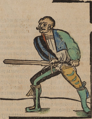 PaurenfeyndtOne of the lesser known fencing masters, Andre Paurenfeyndt published his fencing manual Ergrundung Ritterlicher Kunst der Fechterey ('A Study of the Chivalric Art of Fencing') in 1516. Formally he is part of the Liechtenauer tradition amd many of the original verses appear in his work, but there are also descriptions of techniques that resemble elements of Fiore, for instance the use of the Eisenpfort - porta di ferro parry, the peasant strike colpo di villano or diaginal upstrikes against an attack.Speaking politely, Paurenfeyndt isn't the most gifted teacher around which makes the manuscript difficult to read. While he introduces new names for the various guards (for instance Lichtenauer's Vom Tag he calls Hochort), the verse sections continue to use the old names and even the prose glosses occasionally fall into them. There are illustrations, but the relation to the text remains a bit hazy. While the verses would instruct to remain in binds and follow with techniques like duplieren and mutieren, the sequences described by Paurenfeyndt usually pull back from binds for another attack.