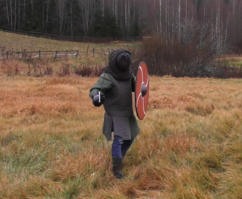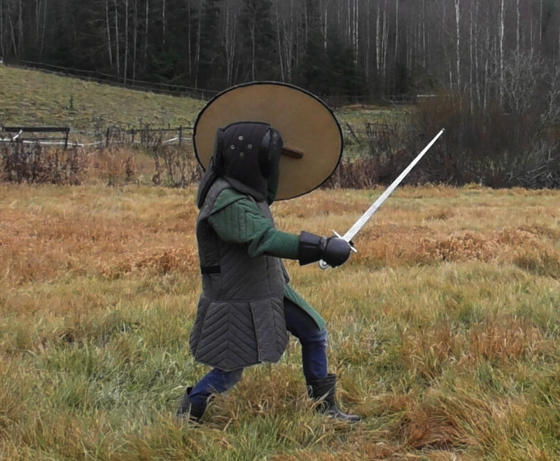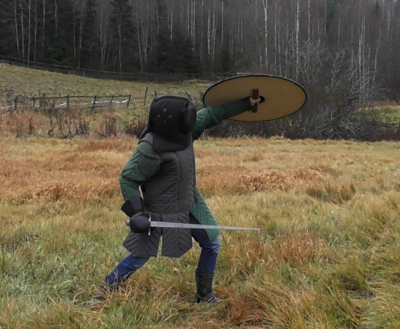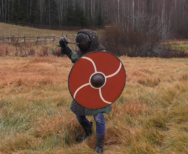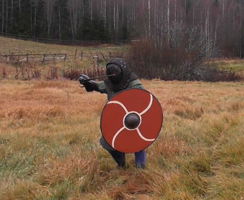The author in late Viking age combat gear. Note: Most Viking-sword replicas I know are too stiff to use safely for thrusting even in full HEMA gear. I am using a full-contact arming sword with rolled tip for sparring with Viking shield, this bends quite a bit when thrusting and doesn't endanger the opponent. Some basic truthsLet's look first into the foundation of tactics based on observing what the equipment is like. To some degree, these govern what is reasonable to do in fencing and what is not.The shield is heavy and slow, the sword is notA large Viking shield typically weighs between 4.5 and 5.5 kg (although using modern materials like plywood, one can build lighter yet still durable varsions), a sword on the other hand less than 1 kg. Moreover, the sword is used with the dominant hand, the shield not.Thus, in combat, the sword can be moved to a new line and attack much faster than the shield simply due to inertia. This makes feints attractive in which the sword is used to get the defender to commit the shield to a large motion which he then cannot undo in time when the real attack is made. Conversely, when defending with a shield, it is important to not over-commit to a motion.