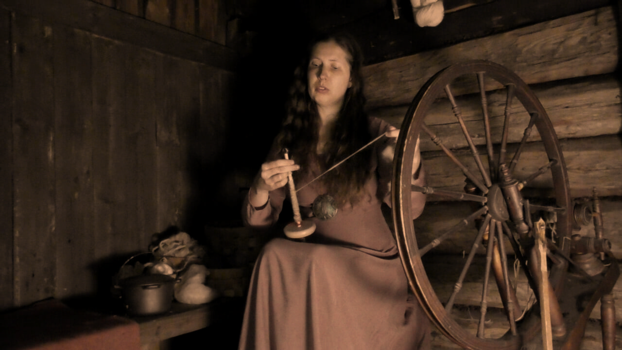 Village lifeGleann an Phéine is a medieval society - not inspired or true to any particular time period, it's a Fantasy movie after all - but villagers do not have modern technology available. During Summer, there is some trade with the lands further south, but in Winter the village is cut off from the rest of the world, and many of the things they use the villagers have to manufacture themselves - in addition to the farming and wood-cutting they need to do to survive. There's a blacksmith (for whom Rórdán works) taking care of metal works, several people hunt and are able to tan their own leather and some families keep sheep, so the villagers can produce wool and even weave their own fabrics. Nature supplies several dyes (plants, berries and mushrooms), and during the winter embroidery is an activity for many. Such work may even be sold to traders, providing the coin to buy the goods the villagers can not produce on their own.