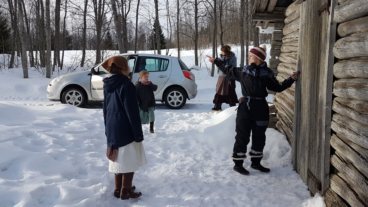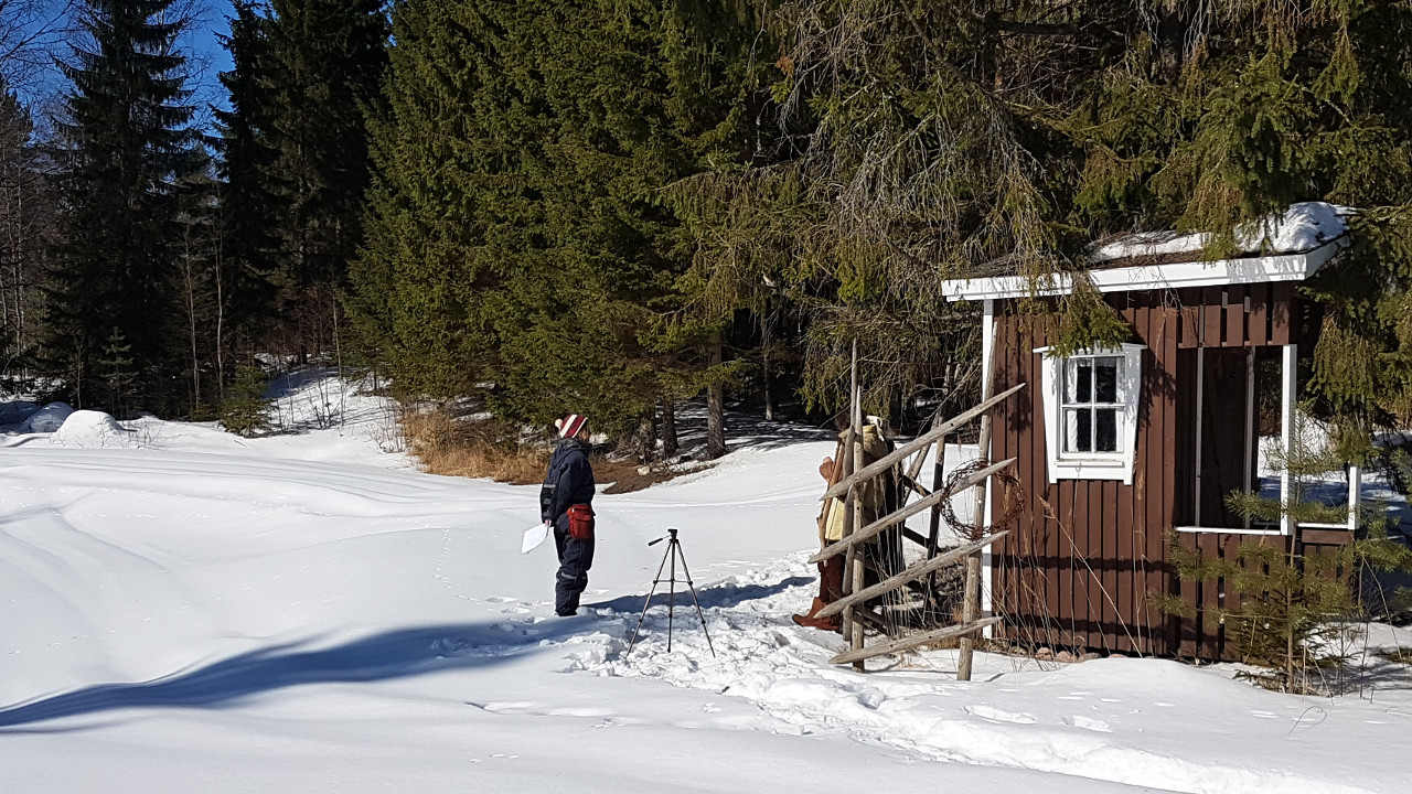 Especially with snow around, we also decide upon a sequence of takes such that we minimize continuity problems with tracks in the fresh snow. Often the camera needs to be positioned via a de-tour to avoid a set of tracks leading right from the scene to the camera position! Only once all that is settled, we make sure the modern equipment is hidden from view - and the actual take can begin. Typically we do a scene for 3-5 good takes from various angles and then do short clips of details we want to show. And when it's all done, we quickly try to get warm again!