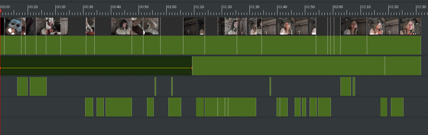 However, the work is not done yet at this point, because there might still be subtle sounds missing. In fact, if you look at the above picture of a scene in the video editor, there are four distinct sound layers (in green) - the first are the sounds recorded on the scene, the last are voices - what then are the other two? The first continuous one is the ambience layer - we usually add a subtle layer of background sounds that characterize the scene - inside Clíodhna's hut, this might e.g. be the sound of a fire. This should not be very notable, but it does affect the mood of the scene. The last layer is the so-called Foley layer (named after Jack Foley who first introduced this to movie making) containing sound effects that are added after the fact (and are usually just a bit enhanced over reality). For instance, shaking a bedsheet or putting a cup down on the table makes characteristic sounds that are not very audible when directly recorded, but if an exaggerated version of them is added to the scene, they make it come alive more. In fact, if you watch any movie and listen to the sounds, you'll be able to hear many sounds which never quite sound that way in reality but would really be missing if they were absent - and that's what the Foley layer is for. And naturally also the Foley layer has to be adjusted for scene acoustics and stereo positioning. So the final sound you get to hear in the movie is the combination of all these four layers merged together - which is quite a bit more work to do than the video itself!
