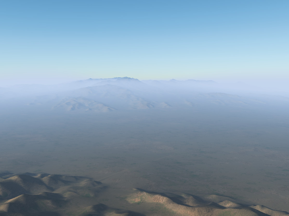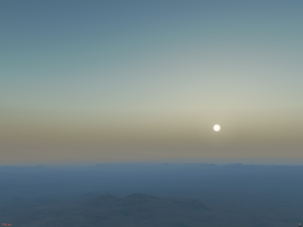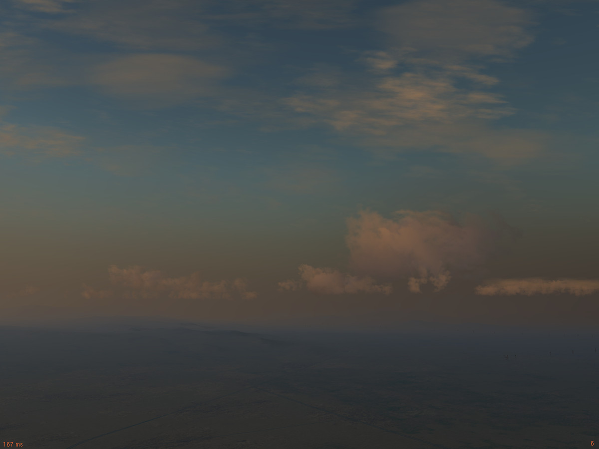A few closing remarksHaze is often treated in rendering as a simple device - as a tool to avoid having to display terrain to a large distance for instance. For a good simulation, especially a flight simulation, this is not what should be done. Haze is a major actor in the visuals we see, and hazes are characterized by complex physics - from the way aerosols and dust are often confined into the lowest boundary layer and trapped by a capping inversion to the complicated play of colors at low light.It seems more tempting to spent graphics card performance on more obvious visual effects than on something as bland as haze, but in fact the resulting visuals are well worth it. After all, haze, clouds and sky is most of what a pilot will see during a flight.