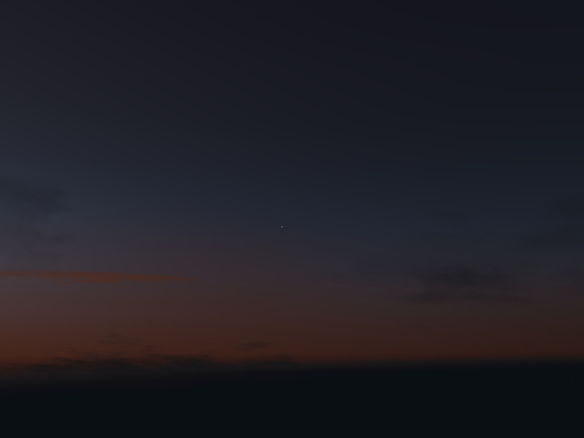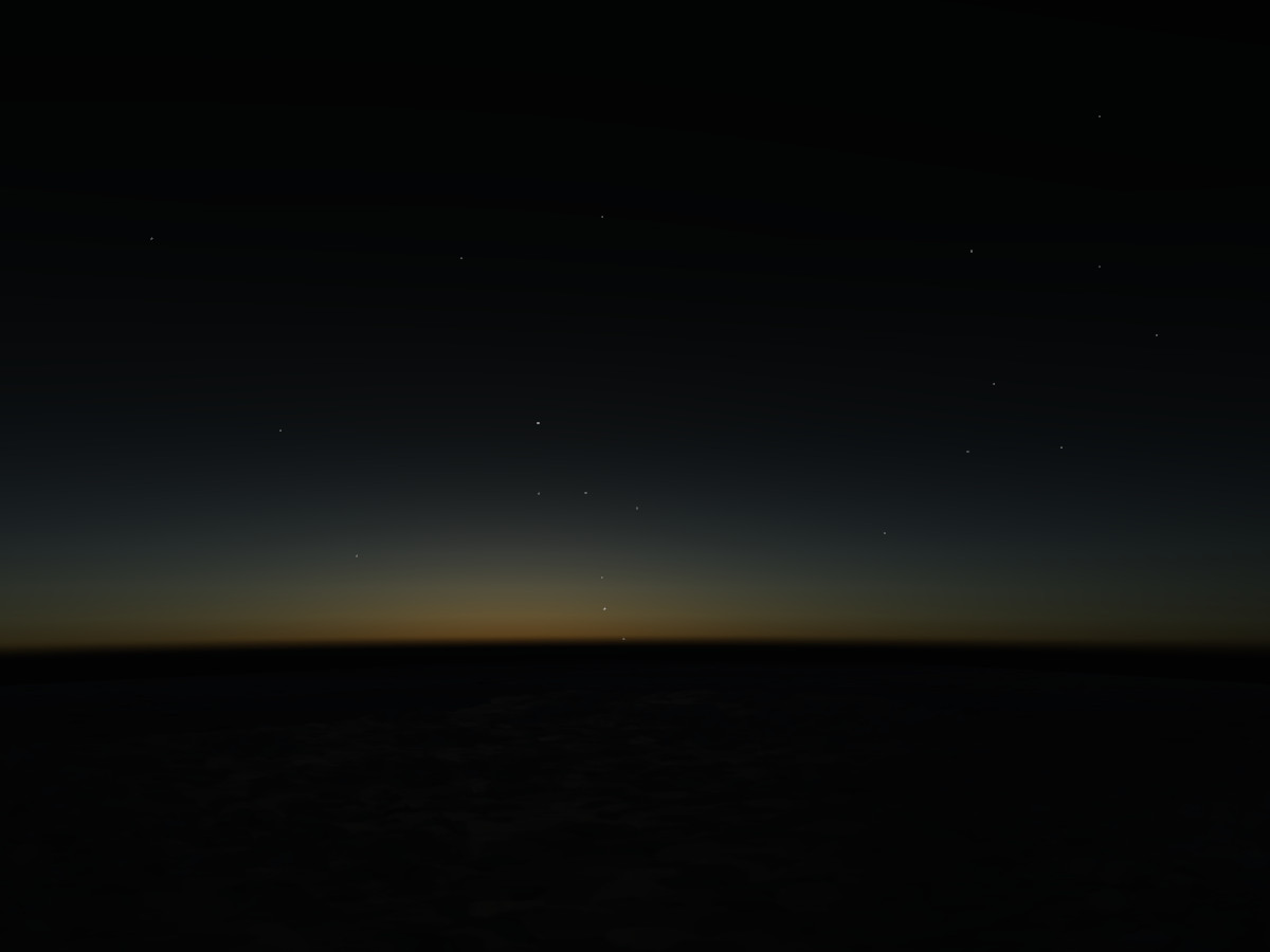 Low lightDuring the day, the I-ray is typically much shorter than the O-ray because the sunlight crosses the atmosphere vertically. The density of the atmosphere is variable in altitude, but effectively the whole vertical extent correspondsto a length of perhaps 10 km, whereas on a clear day objects 200 km distant can easily be seen. This is why Rayleigh out-scattering for the incoming light is not dominant while the sun is high. When the sun is however low or even below the horizon, the path of the illuminating ray through the atmosphere becomes very long. In this situation, light is no longer white but becomes changed in color (predominantly by Rayleigh scattering). Since the blue component is scattered out of the I-ray most strongly, the remaining light is shifted to red, which is why sunrises and sunsets illuminate a scene in red-golden color hues.Under such conditions, it is crucially important that light is computed in a position-differential way, i.e. for every pixel separately and not once for the whole scene. This can only be done inside the GLSL code on the graphics card. Consider the following pre-dawn scene: