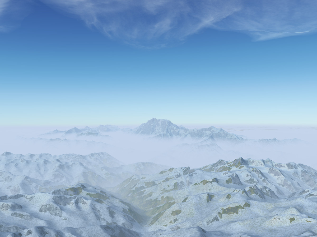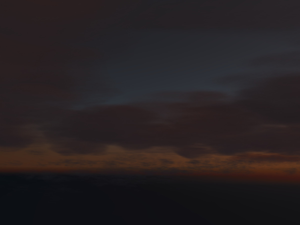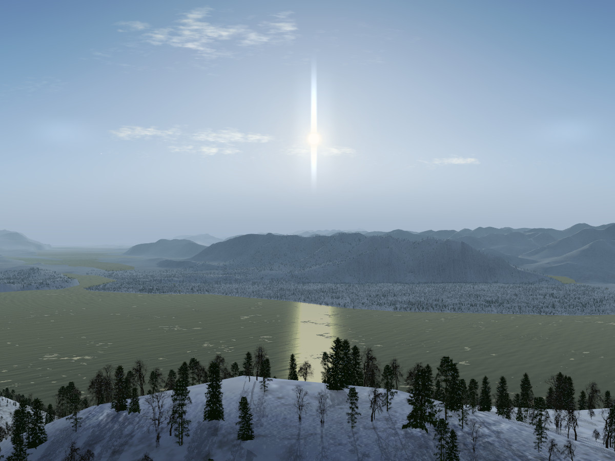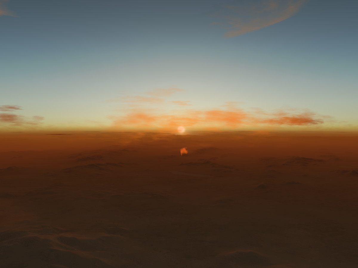 As the sun rises further, high clouds get illuminated long before the low clouds or the lowest layers of haze and fog. In fact, to get the scene right, it is crucially important to compute lighting twice for every pixel - once for the terrain or object itself, and once for the haze between object and eye. The reason is that it can easily be that the haze itself is illuminated and bright while the terrain behind it is still in shadow, or vice versa, that one sees a brightly lit high mountain summit through low, still shadowed haze. While often low light scenes are dominated by Rayleigh scattering on the I-ray, this is not always the case. Compare the following two scenes: If Rayleigh out-scattering of the I-ray is dominant, the whole scene is cast into a strong, golden light: