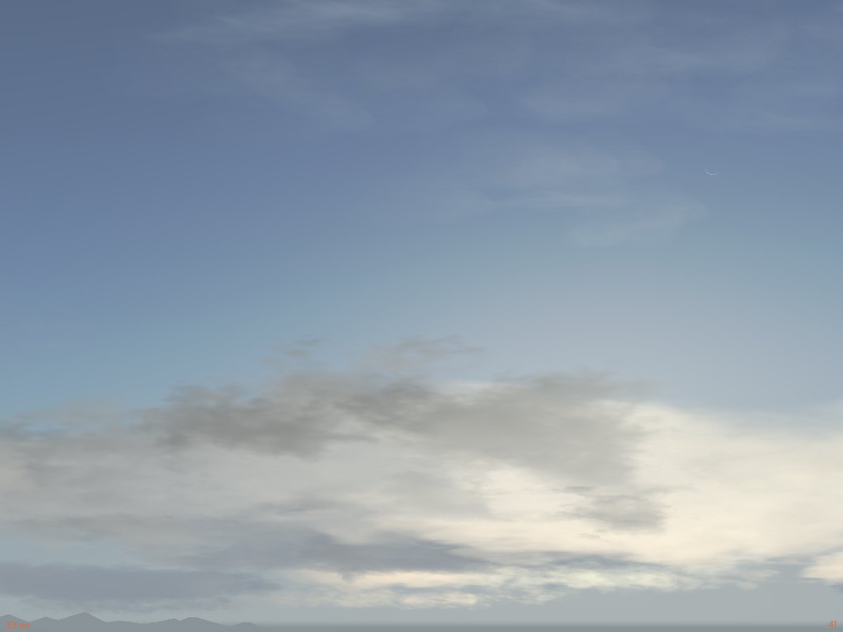 The role of cloudsClouds in nature are just localized patches of particularly thick wet haze. Yet rendering them, they cannot be treated by the same techniques as diffuse haze, because they are not computed as volumetric fog distributions (which would make the integral equations prohibitively expensive to do) but as distinct objects placed into the scene. The problem with this is that while their effect in nature is very pronounced (usually they absorb light much stronger than diffuse hazes), they are not part of the scattering integral equations described above.The ALS framework addresses this problem on multiple fronts. First, Flightgear's weather system passes the relevant properties of the current weather situation to the renderer (i.e. at what altitudes the main layers are, how thick they are, whether there are thicker layers sunward of the current scene and for thick, localized clouds even the location of up to thirty explicit shadows). Second, light scattering effects are rendered on the clouds themselves. For instance, the cloud shader effect lights up thin clouds when sunlight passes through them and strong Mie scattering is active but darkens thicker clouds when the sun is behind them. Since real clouds are a mixture of thin and thick patches, the net effect looks fairly compelling: