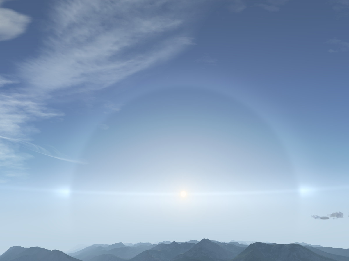 Basic ideaWhen looking at a scene, our attention is inevitably captured by the more spectacular elements - bright specular highlights, reflections in shiny, mirror-like surfaces or bloom effects of bright, blinding light.However, more often than not, natural scenes are not spectacular. Rather, nature usually is a bit bland and unassuming, and most of all subtle. We all know that a clear sky is blue, but there are for instance subtle variations in the hue of that blue throughout the sky. Likewise, fog is usually some blue-grey, but there are subtle variations dependent on where in a sheet of fog the observer is, where the sun is and what direction the observer is looking at. The atmosphere and the clouds and hazes it contains are in fact a major player in what we see - especially in a flightsim where we usually observe the scene from high above. In fact, most color values of the pixels we see outside the cockpit are either sky, cloud or at least partially haze.