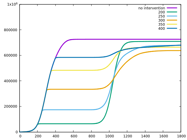 into the scenario and re-run. The epidemic now stops spreading around timestep 200, but produces a violent secondary outbreak around timestep 900 when the seeds grow into substantial outbreaks. Apparently it is highly unstable. Now, let's vary the intervention time from 200 to 400 - you should see something like this: