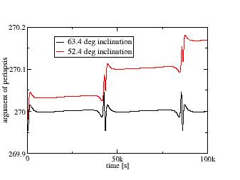 Stability analysisIf you've been looking through the linked article on the orbit, you might have spotted the fact that the reason the peculiar inclination of 63.4 degrees is chosen for the orbit is that Earth's J2 gravity term does not drag the argument of the periapsis (and hence also the important location of the apogee) but leaves it stable at -90 degrees.Well, since we have a numerical tool, let's test this. Change the plot section to