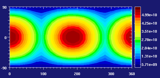 Total irradiationFor the total irradiation summed over two orbits, this has interesting consequences. Take the subsolar point at periapsis (i.e. the point at which the Sun is in the zenith). Since Mercury is at periapsis, the distance to the Sun is smallest, so the radiative flux arriving is largest. At the same time, the apparent motion of the Sun in the sky holds for a couple of days, which means this surface point gets exposed to a high radiation flux over an unusually long period of time. And an orbit later, the same happens for the point 180 degrees around the planet.When one plots the total irradiation received as a function of latitude and longitude, it becomes clearly apparent that there are two points on the equator which receive maximal energy while the points 90 degrees off in longitude receive less than half of that value. Superimposed is the gemeotrical reduction of the irradiation by the radiation incident angle at high latitudes.