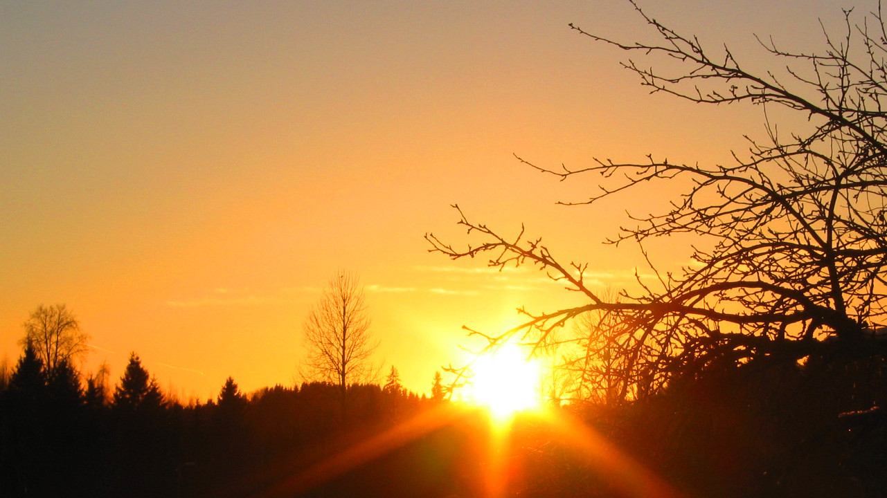 The illuminating rayAbove we've seen how Rayleigh scattering affects the color of the Sun disc we see. However, often most of the atmospheric moisture is really in the lower layers - often close to the ground in the convective zone. That low haze is then illuminated by the sunlight after it passed the upper atmosphere and underwent Rayleigh scattering - in other words, low haze can be illuminated by colored light. In this case, the Mie halo as well as larger regions of the sky (including clouds of course) are also affected by the shift in light color.