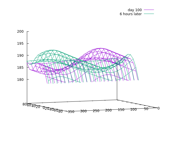 The result shows a planet with strong seasonal temperature variations at the poles, however equatorial temperatures are significantly more stable. Looking along the longitude axis requires a different approach. Let's run the simulation to 100 days and compare with 100.25 days (that is six hours or half a planetary rotation period later) - this shows the following:
