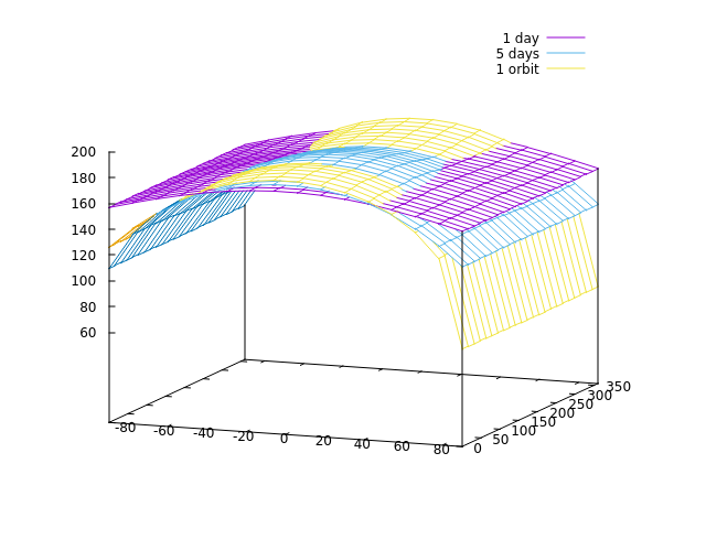 Interpreting temperature plotsIn the absence of an albedo map or complicated spin-orbit resonances, what you see when you project into the latitude axis is seasons, what you see in the longitudinal axis is the daily temperature variation.Let's take a look at seasons first. With an axis tilt of 35 degrees, there should be fairly pronounced seasons. The simulation is, unless otherwise instructed, initialized at periapsis with the axis tilted 90 degrees to the starward direction - which is the northern hemisphere spring equinox. Thus running it for 0.75 orbital periods brings the northern hemisphere winter, to 1.25 periods the northern hemisphere summer.
