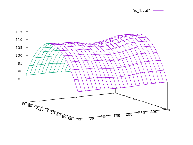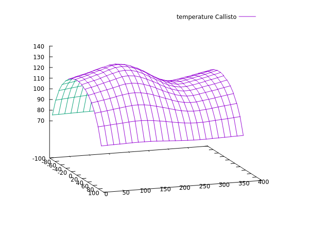 The distribution in latitude is given by the sun angle, the overall range agrees with measured values, the dip in mid-longitudes (the planet-facing side) is driven by eclipses (you can verify that by switching eclipse finder off, and also that the depth of the dip is a bit reduced by indirect radiation. But why is the distribution so flat in longitude, why is no solar heating peak seen? The apparent sun position moves around with the orbital period but Io's orbital period is just 1.7 days, so that is a fairly long 'day' and not a fast rotation that would flatten everything. It turns out however that in the temperature regime we're looking at here, this is a fast rotation. We've often been looking at worlds with the potential for liquid water, around 250 K. At the 100 K of Io, the Stefan-Boltzmann law states that the rate at which the surface cools is 40 times less than at 250 K. Also the solar irradiation is rather weak. As a consequence, compared with the timescales for cooling and heating, Io's rotation is blazingly fast, and hence there is no time to create a pronounced heating peak. A look at CallistoTo test this idea, let's replace Io by Callisto - which as an orbital period of 16.6 days.