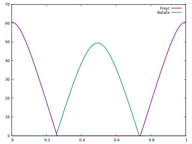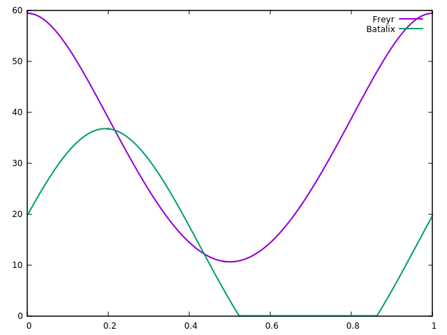 The variable norm_daytime corresponds to fractions of a full rotation - a value of 1 means te rotation is completed. The variable sun_angle requests the elevation of the sun above the horizon. The keywords lat and lon allow to select a specific geographic location, and body companion selects the angle of Freyr (body star would select Batalix). The time of 260 days is chosen such that Freyr and Batalix are in opposition, and this is what the plot shows - when one star sets, the other rises: