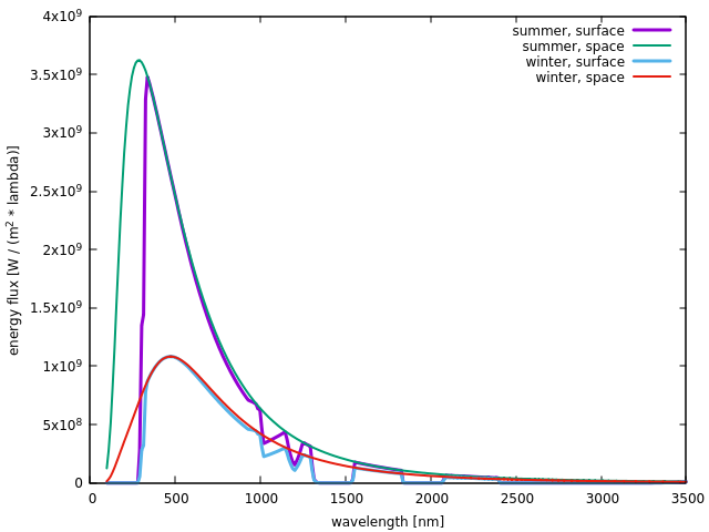 The plot shows that Freyr emits very hard UV light that however is completely captured by the atmophere. Especially in summer, a sizable fraction of the total never reaches the planet's surface, and even eye-balling the graph, it seems that the fraction of energy captured by the atmosphere is much higher than on Earth. Doing the numbers, this turns out to be quite true: Whereas Earth's atmosphere captures about 18% of the incoming energy in the atmosphere, the fraction is a whopping 33% during Helliconia summer and still 22% during Helliconia winter (when Freyr's contribution is smaller). It is particularly relevent that the summer and winter fractions are different - as this in essence means the overall albedo of the atmosphere is higher in summer (again, the atmosphere as such does not need to change, it is the relative UV content of the incoming radiation that is different, which again happens only in a binary star system). Stratosphere structureRunning the code to do the temperature profile of the atmosphere reveals the following picture: