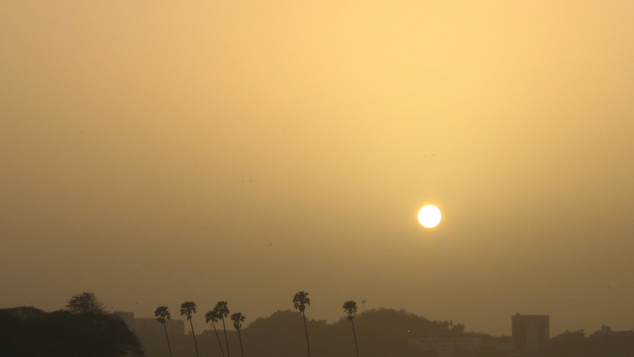 Haze and HumidityWe've earlier stated that Rayleigh scattering happens on air molecules, but also on dry hazes such as tiny salt crystals or smoke particles floating in the air - the important thing is that the scattering centers are smaller than the wavelength of visible light, which starts at around 400 nm.This raises the question - what about man-made pollution? There is lots of emission above major urban centers - do they have particularly stunning sunsets with brilliant colors? Often they do not, see the following example of a hazy sunset in Mumbai.