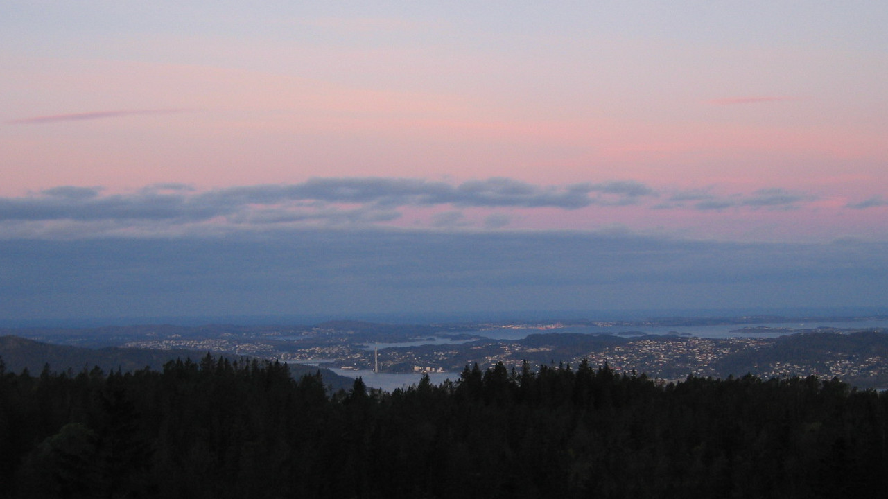 Is is Mie scattering seen from the other side which makes clouds in direct light appear dark - if they're translucent enough. If they start to be opaque, diffuse scattering takes over and the cloud behaves as we are used from solid objects - the illuminated side is bright, the shadowed side is dark. Otherwise, many of the processes discussed earlier also apply to the away-side. For instance, the following picture shows a high haze layer already illuminated by the rising sun, whereas a lower layer is still in indirect light only and takes a blue-violet color. Since the indirect illumination is chiefly from above, there is no dark-lining visible yet - this appears later when also the lower layer is directly illuminated.