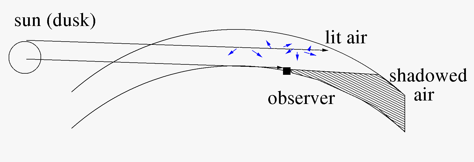 In essence, it is nothing but the shadow of Earth cast into the atmosphere. Since the surface of Earth is curved, the region behind a sunward-looking observer is progressively 'falling away' from the light rays, and hence no longer directly illuminated. As a result, the blue Rayleigh glow ceases and the atmosphere darkens.