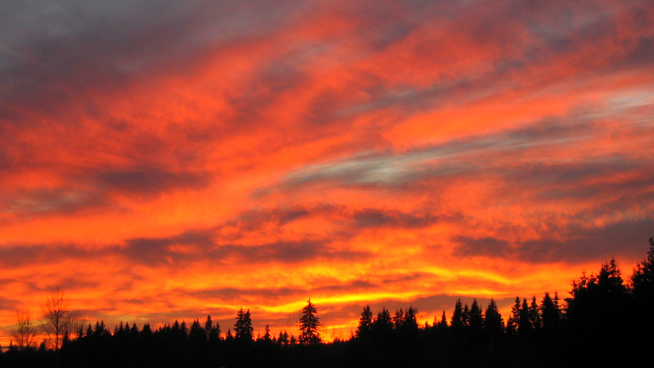 Time DependenceFundamentally a sunset is a transient phenomenon - the Sun does not remain low in the sky but continues to sink below the horizon. As a result, illumination changes all the time, and as the path through the atmosphere changes, so do colors.At the same time, clouds move and evolve, especially when the wind is strong. This, too, can change the visible scene quite a bit. How quickly does the Sun sink? That depends on latitude and season. The angle under which the path of the sun in the sky hits the horizon is steeper at the equator than in high latitudes - an equatorial sunset can be over within few minutes and darkness comes quickly, up in Finland the same might last half an hour and near the poles there is low light for days and days. Here is a time series in which many different elements are seen - note how colors change from yellow-golden to red as the path of the illumination ray through the atmosphere grows, how the relief illumination of the cloud layer changes with illumination angle and how the clouds move towards the viewer.