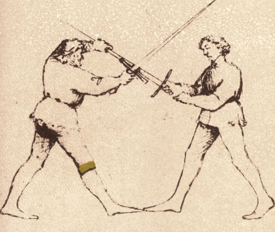 Out of these, close-play is chiefly wrestling with the blade and less what people would usually call 'fencing' (this comment is not meant to dismiss close-play - in a real swordfight there is an obvious need to deal with such situations). Of the about 15 wide-play techniques, only one (the punta falsa) is a clearly offensive technique and can be used to attack, five (rompere di punta, scambiare de punta, colpo di villano, defence against low attacks and the diagonal parry) are clearly defensive and require the opponent to act first and the rest is neutral -the techniques start from blades crossing but either combatant can then initiate them. My general impression is that Fiore is originally meant to give noble officers an edge in war when they are up against opponents whose idea of swordfighting is to do the obvious - hit hard and fast and keep cuts coming. From my own experience I can say that Fiore techniques work really well against enthusiastic beginners because they often get confronted with surprising developments they simply hadn't thought of - like a grab for the blade, or half-swording (gripping the own sword on the handle and on the blade to get a better lever-arm).