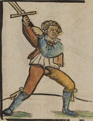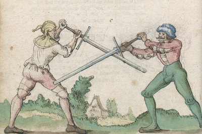 LiechtenauerWhile Johannes Liechtenauer is arguably one of the greatest longsword fencing masters in the German tradition, there is no surviving fencing manual authored by him. Instead, what is available are illustrated glosses of Liechtenauer's zettels - verses probably intended as mnemonic aids for students, for instance (Pseudo)-Peter von Danzig has published such a gloss in 1452.These manuscripts are not a systematic introduction to the art of longsword-fencing (or one-handed or mounted fencing which is also part of them). For starters, they likely assume that the student knows some basic fencing like cuts, thrusts, blocks and legwork. On they other hand, they occasionally compare to 'what common fencers do' (and what the Liechtenauer student should not do), so - just as Fiore - the techniques described are intended to be special. The opponent assumed is someone who fences with a longsword in single-combat and may even know how to cut an attack away or to feint, but is not himself familiar with the Liechtenauer system. The manuscripts are loosely organized according to techniques - plays from the various special cuts like Zwerchhau or Schielhau are grouped together, general advice is given in between, usually a rhyme introduces a new section and the following gloss explains the meaning. While this is never stressed clearly, one does get the feeling that Liechtenauer follows an overarching philosophy how attack and defense in a swordfight should be organized and the techniques and sequences described illustrate general principles. For instance, one of the central concepts is the idea of master cuts that 'break' certain guards, i.e. if you use this cut to attack someone standing in a certain guard, he cannot easily counter because the line for the counter is closed by the master cut. This makes it possible to attack 'safely', i.e. without running the risk of simultaneous hits.