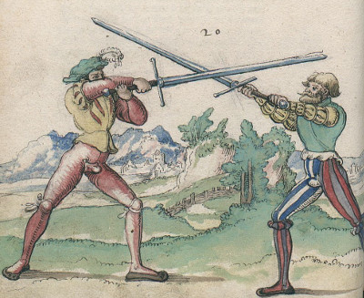 Perhaps not unexpected, the manual also contains a fair share of pommel strikes, grappling and throwing techniques for close play, supplemented by techniques for holding an opponent down when he is on the ground. It's hard to get a sense for what tactics Paurenfeyndt actually envisioned - clearly he deviates from Liechtenauer in places, but apart from sequences and the quoted Liechtenauer verses, he hardly describes his own idea of fencing. Perhaps then the manual is best understood as a collection of tricks and techniques that have proven useful in exchanges- and of course it provides an interesting historical data point between Liechtenauer and Meyer. Paurenfeyndt's manual on Wiktenauer MeyerJoachim Meyer's Gründtliche Beschreibung der Kunst des Fechtens ('Thorough Description of the Art of Fencing') of 1570 is a long and systematic introduction to the topic covering not only longsword (which Meyer regards as the basis of all fencing) but also dusack, rapier, dagger and polearms.By Meyer's time, fencing is no longer a necessity in war but is well into the transition to a sports activity. Thrusts are no longer done and no pommels are hammered into faces, so fencing for Meyer is primarily an exchange of cuts and while his system is based on Liechtenauers work, he finds little use for the old thrusting guards that provide poor opportunities for quick and powerful cuts. Meyer lays out longsword fencing for a complete beginner - he starts with basic elements like guards, cuts and parries, then discusses the general idea of an exchange as approach, attacks and retreat and only in the end gets to specific sequences from the various guards or from the master cuts like in the Liechtenauer Zettels, At the heart of the system is the idea of attacking in longer sequences of cuts moving from one opening to the other while keeping the opponent defending all the time. By executing some of these attacks for real, some only as feints, the opponent is not being given much opportunity to counter. If the opponent manages to get a defensive cut in, a bind usually develops and Meyer argues that in the bind, a fencer can similarly attack in many different ways around the contact point and thus keep the initiative. In the defense, Meyer takes a somewhat more positive view of simple blocks than Liechtenauer does. In essence he argues that while blocking an attack doesn't gain a fencer the initiative, it does gain the time to prepare a more effective defence like a cut to the blade - from which a counter attack can start.