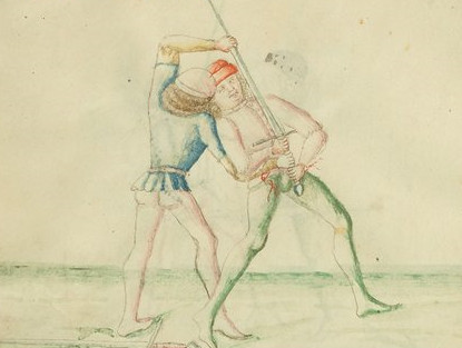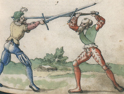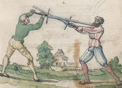 Historical Swordfighting Systems - an OverviewFioreThe illustrated Italian fencing manuscript Fior di Battaglia ('The flower of battlle', around 1400) by the knight Fiore Furlano de'i Liberi is one of the earliest fencing manuals describing longsword techniques that has survived. The manuscript itself isn't particularly focused on longsword - it treats many kinds of combat, including wrestling, the use of the dagger and the one-handed sword or mounted combat.The Fiore system appears to aim at being applied in actual wars. Not only does it describe encounters of different weapons (longsword vs. spear) or describe techniques which are chiefly of use when faced with multiple opponents such as the volta stabile (a quick turn without changing position), but it also includes techniques which are brutally effective, but have little resemblance to lofty ideas about noble knightly combat - for instance kicks into the groin or to the knee: